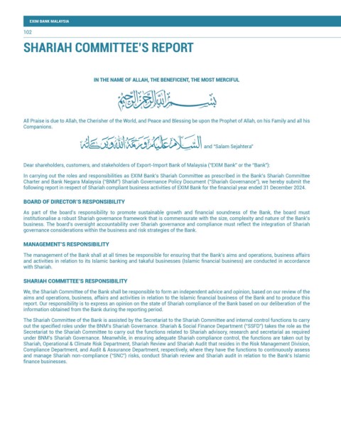 following report in respect of Shariah compliant business activities of EXIM Bank for the financial year ended 31 December 2024.