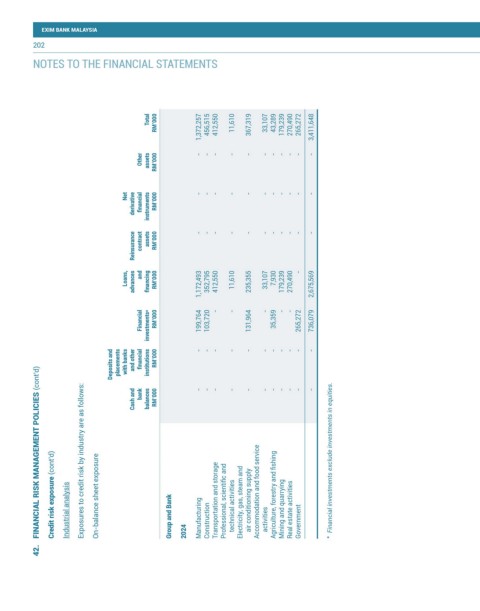 Credit risk exposure (cont’d) Industrial analysis Exposures to credit risk by industry are as follows: On-balance sheet exposure Group and Bank Manufacturing Construction Transportation and storage Professional, scientific and technical activities Electricity, gas, steam and air conditioning supply Accommodation and food service activities Agriculture, forestry and fishing Mining and quarrying Real estate activities Government * Financial investmen