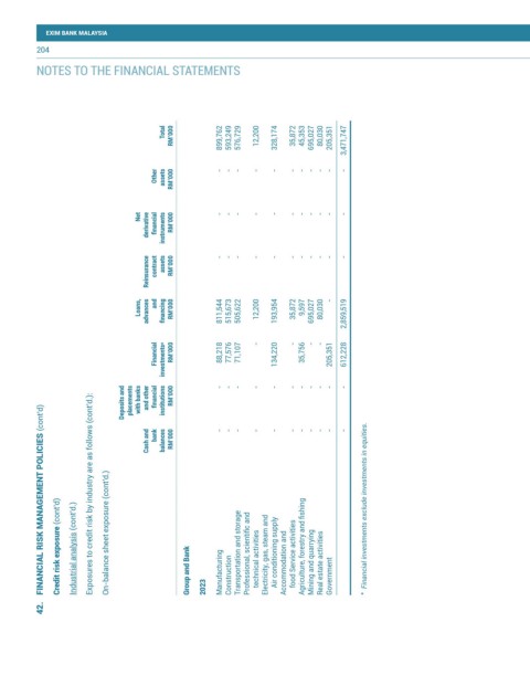 Credit risk exposure (cont’d) Industrial analysis (cont’d.) Exposures to credit risk by industry are as follows (cont’d.): On-balance sheet exposure (cont’d.) Group and Bank Manufacturing Construction Transportation and storage Professional, scientific and technical activities Electricity, gas, steam and Air conditioning supply Accommodation and food Service activities Agriculture, forestry and fishing Mining and quarrying Real estate activities Govern