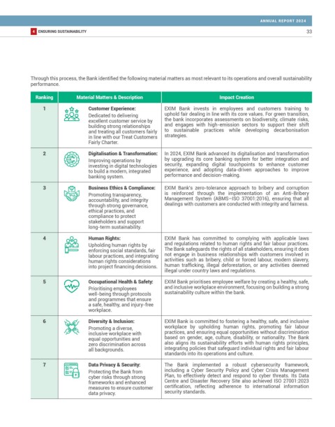 Through this process, the Bank identified the following material matters as most relevant to its operations and overall sustainability