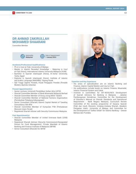 • Shariah Committee Member of Bank Muamalat Malaysia Berhad • Involved in committees for AIF-NOSS/NCS Development