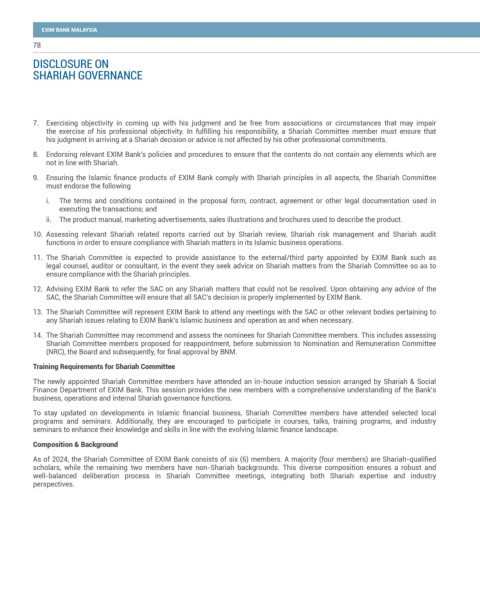As of 2024, the Shariah Committee of EXIM Bank consists of six (6) members. A majority (four members) are Shariah-qualified