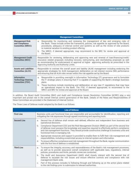 important and pivotal role in the overall internal control governance of the Bank. Details of the Roles and Responsibilities of