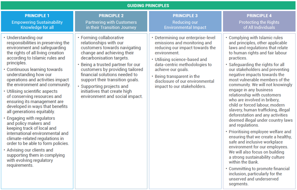 Our Sustainability Framework integrates Shariah principles with robust governance, proactive risk management, and regulatory compliance. Key elements include Shariah-compliant financing products, oversight by an independent Shariah Committee, and strong internal controls to mitigate non-compliance risk. The Framework emphasises ESG integration and green financing and sustainable Islamic finance aligned with Malaysia’s net zero ambitions.